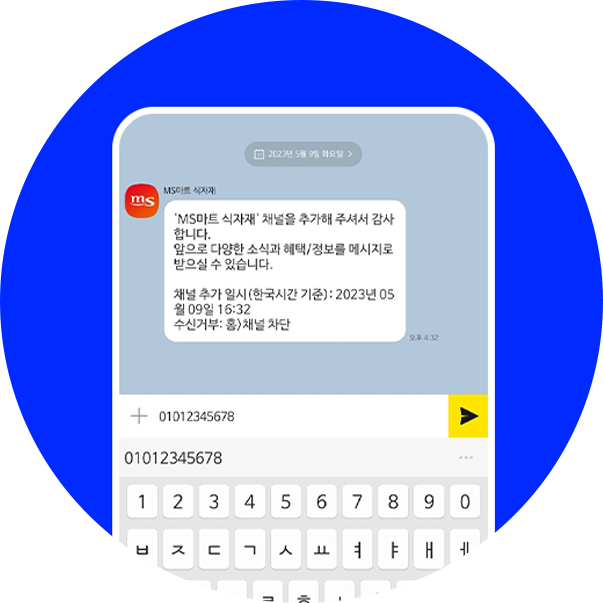 ③ 1:1 채팅 신청 후, MS마트 앱 회원가입 시, 기입한 휴대폰 번호 입력